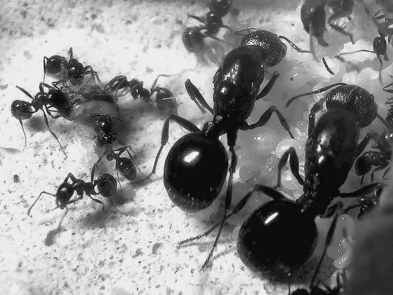 В природных условиях тоже происходит нечто подобное. Действительно, иногда муравьи, чтобы доставить в гнездо жидкую еду, например, гемолимфу раненого насекомого, используют пористые предметы.