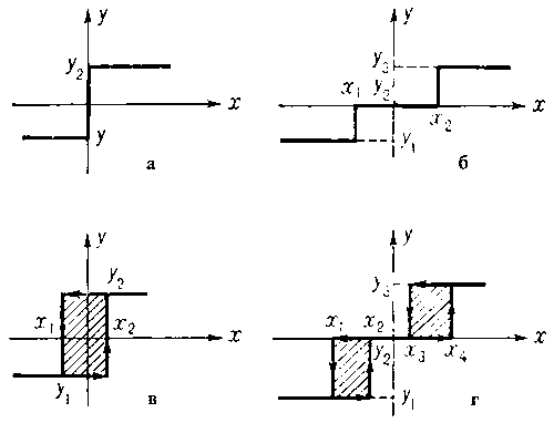 Релейные характеристики двухпозиционных (а, в) и трехпозиционных (б, г) релейных элементов.