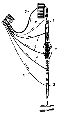 Мышечное веретено (схема): 1 — конец интрафузального мышечного волокна, прикрепленный к скелетной мышце; 2 — конец того же волокна, прикрепленный к сухожилию; 3 — так называемая ядерная сумка волокна со спиралевидными рецепторами; 4 — толстые чувствительные нервные волокна, идущие от рецепторов мышечного веретена; 5 — тонкие, так называемые гамма-эфферентные, нервные волокна, вызывающие большую или меньшую степень сокращения концевых участков мышечного веретена; 6 — двигательное нервное волокно, идущее к скелетной мышце.