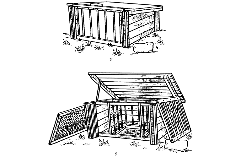 а – гнездовой садок для наседки помещен внутри; б – садок помещен снаружи