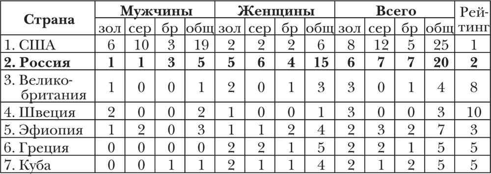 Если считать очки по первым восьмеркам, мы так же вторые за командой США, у которой 238,5 очков (185 в Сиднее). У России – 188,5 очков (132 в Сиднее, 130 в Атланте). Но если наша мужская команда заняла третье место, то женская – первое, причем с огромным отрывом. Наши девушки на 58 очков опередили команду США. Безоговорочным было их преимущество как по общему количеству медалей, так и по числу медалей любого достоинства.