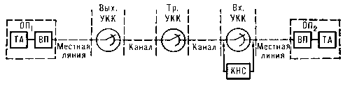 Функциональная схема телеграфной связи по системе прямых соединений: ОП1 , ОП2 — оконечные пункты; ТА — телеграфный аппарат, оборудованный автоответчиком; ВП — вызывной прибор; Вых. УКК, Тр. УКК, Вх. УКК — соответственно выходной (исходящий), транзисторный и входной (входящий) узлы коммутации каналов, в которых установлены станции прямых соединений; КНС — коммутатор низовых связей, с помощью которого производится переприем телеграмм на станции входного узла коммутации каналов.