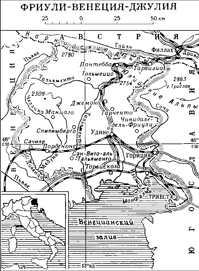 Фриу'ли-Вене'ция-Джу'лия (Friuli-Venezia Giulia), административная область на С.-В. Италии, в Карнийских и Юлийских Альпах, частью на Паданской равнине, у Венецианского залива Адриатического моря. Включает провинции Триест, Гориция, Удине, Порденоне. Площадь 7,8 тыс. км2 . Население 1232,5 тыс. чел. (1973). Главный город — Триест. Экономика имеет индустриально-аграрный характер. В промышленности занято более 45% экономически активного населения, в сельском хозяйстве свыше 10%. Добыча плавикового шпата (район Удине), свинцово-цинковых руд (рудник Райбль, провинция Удине). Чёрная металлургия (гг. Триест, Сервола, Удине); машиностроение, особенно судостроение (главным образом в гг. Монфальконе и Триесте) и производство судовых двигателей (Триест); электротехническая, химическая (в т. ч. производство искусственных и синтетических волокон в Гориции, Монфальконе, Торвискозе), целлюлозная, нефтеперерабатывающая, деревообрабатывающая, текстильная, пищевая промышленность. Производство электроэнергии 4,1 млрд. квт ·ч (1972), 2 /3 на ТЭС, остальное на ГЭС.