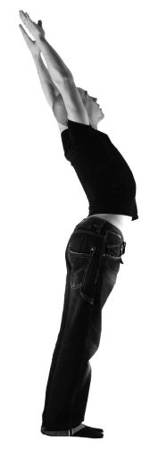 Первое упражнение растяжки – прогиб стоя (фото 33). Потянитесь вверх руками, вытягивая позвоночник, затем аккуратно прогнитесь назад, не запрокидывая голову. В первую очередь сгибается грудной отдел позвоночника, далее – шейный и поясничный отделы. Резких, «ломаных» перегибов быть не должно. Если запрокинуть голову назад, можно защемить крупные сосуды, обеспечивающие подачу крови к головному мозгу, и потерять сознание. Прогибаясь назад, не перенапрягайте поясничный отдел позвоночника. Поясница – наиболее «эксплуатируемый» отдел позвоночника, она легче всего гнется, и создается соблазн прогнуться назад сильнее, чем это требуется. Стоит ли говорить, что такие «эксперименты» чреваты травмами. Чтобы обезопасить поясничный отдел, держите мышцы нижнего пресса – от пупка и ниже – слегка напряженными – это поможет вам контролировать процесс.