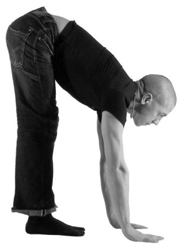 Исходное положение – станьте ровно, ноги вместе, спина прямая, тело расслаблено. Медленно наклоняйтесь вперед до тех пор, пока не почувствуете сопротивление мышц. Мышечное сопротивление будет ощущаться либо в задней поверхности ног, либо в спине. Почувствовав напряжение, продолжайте наклоняться, но с удвоенной осторожностью. Если появляется хотя бы намек на боль, значит, вы «перетянулись» и необходимо уменьшить наклон. Определив «предельную степень» наклона, попытайтесь расслабиться, сохраняя положение. Если болевые ощущения не возникли, можно усложнить упражнение, взявшись руками за ноги (фото 34) и, притягивая тело к ногам, сделать небольшую прокачку. Прокачка – это попеременное усиление и ослабление зафиксированной позиции. В данном случае, подтягивание тела к ногам и последующее расслабление.