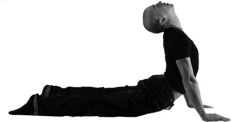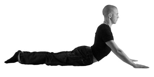 4. Прогиб лежа на животе (змея). Исходное положение – лежа на животе, руки согнуты в локтях, ладони под плечами. Поднимите голову, потянувшись макушкой вверх. Далее приподнимите грудь и живот. Нижняя часть живота не отрывается от пола. Подъем происходит за счет сокращения мышц спины. Прогнувшись до упора, можно опереться на руки, продолжая тянуться макушкой вверх. Ни в коем случае не прогибайтесь за счет выпрямления рук, не позволяйте плечам подниматься. При появлении напряжения в спине уменьшите прогиб. Смотрите прямо перед собой в одну точку (фото 36).