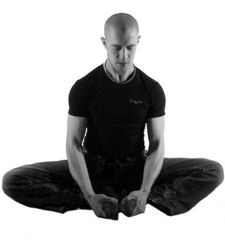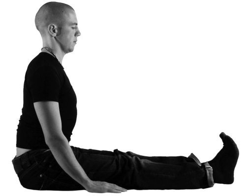 9. Бабочка. Сидя на полу, раздвиньте колени в стороны, ступни вместе. Позвоночник прямой. Упритесь руками в пол (фото 48). Также можно взяться руками за ступни, надавить на колени, стремясь прижать их максимально к полу. Главное при этом сохранять вертикальное положение позвоночника.