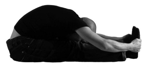 Если при выполнении наклона вы не можете взяться за ноги в районе ступней, как показано на фото, ничего страшного: обхватите руками колени или куда дотянетесь.