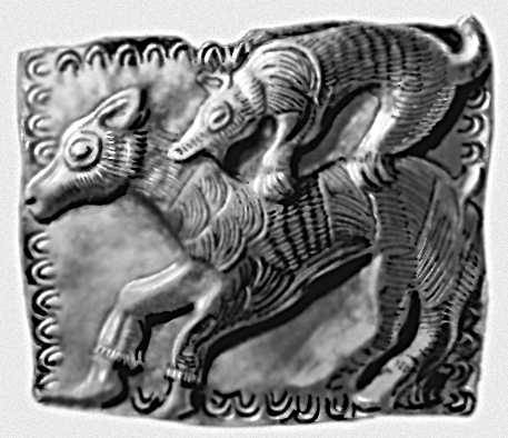 Бляшка с изображением нападения волка на серну. Серебро с позолотой. Начало 4 в. до н. э. Национальный музей. Ловеч.