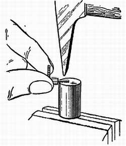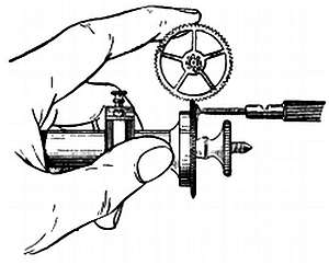 Для определения глубины зацепления всегда надо начинать с промежуточного колеса и секундного триба. Заостренную чурку прижимают к верхней цапфе оси секундного колеса. Другой чуркой покачивают промежуточное колесо и проверяют зазор зубьев промежуточного колеса в трибе.