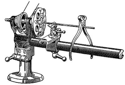 Устранить перекос колеса несложно. Например, исправляя перекос центрального колеса, следует вначале расширить одно из отверстий (в мосту или платине), запрессовать в него латунную пробку и просверлить в ней новое отверстие. Лучше всего эту операцию производить с верхним отверстием (в мосту), так как в данном случае не изменится высота установки центрального триба относительно барабана. Если в верхнем отверстии имеется камень, следует провести обработку нижнего отверстия (в платине), внимательно следя за тем, чтобы высота центрального триба и барабана остались неизменными. При обработке верхнего отверстия до запрессовки пробки следует проверить соосность верхнего (рассверленного) и нижнего отверстий. Для этого вставляют платину в патрон токарного станка, вводя конусообразный конец центрирующего стержня патрона в центральное отверстие платины и устанавливают подручник широкой стороной параллельно платине (фиг. 70).