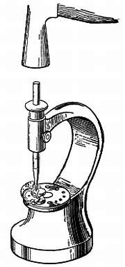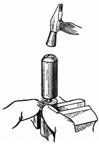 Затем заостряют пуцгольц, вставляют его в рассверленное отверстие моста и быстро вращают, пока конец пуцгольца не примет форму отверстия. После этого на конец пуцгольца надевают кусачки (как показано на фигуре) и осторожно вращая платину наблюдают за биением пуцгольца. По окончании проверки платину снимают с оправки и производят запрессовку пробки и ее сверление. Возможно также использовать пробку с заранее изготовленным отверстием. Для этого подготавливают кусочек проволоки с отверстием диаметром меньше диаметра цапфы оси; в это отверстие вставляется цапфа оси. Затем, запрессовав эту пробку в отверстие, кладут мост на наковальню потанса и производят легкую расклепку пробки с обеих ее сторон (фиг. 71).