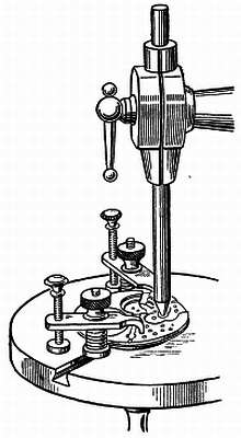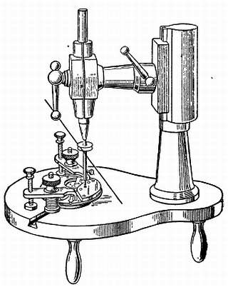 Не снимая платины с оправки, устанавливают мост секундного колеса. Затем опускают центрирующий стержень на мост и намечают место нового отверстия; вращая центрирующий стержень, можно сделать достаточно глубокую отметку. Вначале отверстие сверлят несколько меньшего диаметра, чем требуется. Отверстие просверливают на том же потансе, не снимая платины, как показано на фиг. 74.