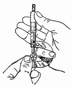 При измерении колес микрометром необходимо держать инструмент вертикально в правой руке (фиг. 78).