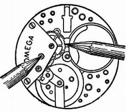 Каждое колесо приподнимают пинцетом. Такая проверка помогает установить, что цапфы свободно вращаются в своих отверстиях. Следующим важным вопросом является глубина зацепления.