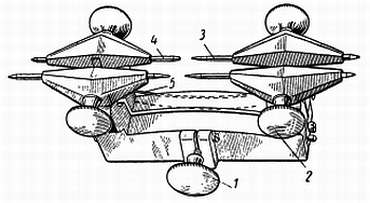 1 — винт регулировки глубины зацепления; 2 — винты для зажима центров; 3 — центр с острием; 4 — центр с коническим отверстием; 5 — пружина, приводящая в движение шкалу.