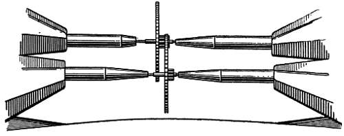 Колеса, подлежащие проверке, вынимают из механизма. Один из пуансонов зажимают винтом 2, другой оставляют свободным. Наружный острый конец зафиксированного пуансона помещают в отверстие платины для цапфы секундного колеса. Затем, удерживая инструмент вертикально, регулируют винт 1 таким образом, чтобы второй, параллельный первому пуансон вошел своим острым концом в отверстие для оси ходового колеса. При этом нужно следить за правильностью положения пуансонов, которые должны быть перпендикулярны к платине. Если пуансоны отклоняются в какую-либо сторону, то это приведет к установке неправильного расстояния между центрами колес. После этого секундное колесо и ходовое колесо помещают в мерительный инструмент и регулируют пуансоны таким образом, что колесо входит в зацепление с трибом, и затем проверяют их глубину зацепления (фиг. 83).