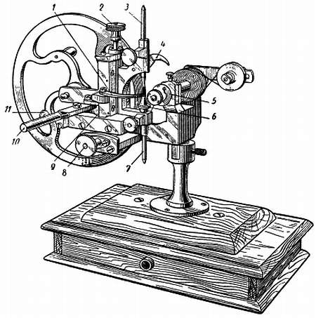 1 — индикатор для установки колеса по высоте; 2 — регулировка высоты колеса; 3 — центр; 4 — индикатор для центрирования колеса; 5 — фреза; 4 — подставка под колесо; 7 — центр; 8 — регулировка центричности колеса; 9 — салазки, несущие колесо; 10 — рукоятка для удержания салазок в переднем положении; 11 — винт регулирования глубины резания.