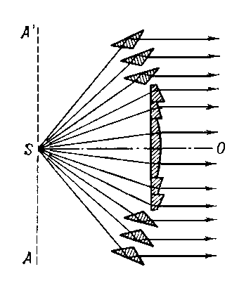 Ф. л. бывают кольцевыми и поясными. Первые представляют собой систему, получаемую вращением изображенного на рис . профиля вокруг оптической оси SO ; они направляют световой поток в каком-либо одном направлении. Поясные Ф. л. получают вращением этого же профиля вокруг оси ASA' , перпендикулярной SO ; они посылают свет от источника по всем горизонтальным направлениям. Диаметр Ф. л. — от 10—20 см до нескольких м .