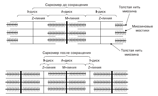 В основе мышечного сокращения лежит перемещение нитей актина относительно нитей миозина (рис. 4). Нити актина двигаются, как по туннелю, между миозиновыми фибриллами, за счет чего укорачивается ширина Н-полоски. Такое вклинивание актиновых нитей между миозиновыми приводит к уменьшению длины мышцы (изотоническое сокращение). При изометрическом сокращении одни саркомеры сокращаются, другие растягиваются, что обеспечивает отсутствие изменения длины волокна. В процессе скольжения нитей каждый мостик может сцепиться с одним актиновым участком, продвинуть нить актина на какое-то расстояние, затем отсоединиться от него и войти в контакт со следующим мостиком.