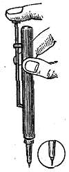Плоские поверхности камневых опор и масленки прочищают палочкой, заточенной в форме перового сверла.