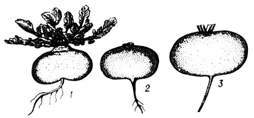 Сорта репы: 1 — Петровская 1; 2 — Миланская белая красноголовая; 3 — Майская жёлтая зеленоголовая 172.