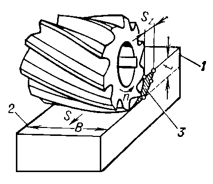 Рис. 1. Схема резания при фрезеровании цилиндрической фрезой: 1 — обрабатываемая поверхность; 2 — обработанная поверхность; 3 — поверхность резания.