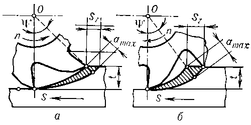 Рис. 2. Схемы фрезерования: а — против подачи; б — по подаче.
