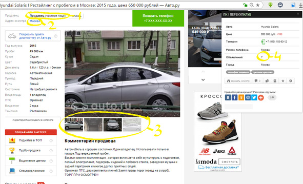 3 – Фотографий мало и они неинформативные. Все фото обрезаны, вида сзади и салона нет вообще. 4 – Расширение подтверждает то, что это объявление от перекупщика. С этого номера телефона он продает 7 автомобилей.