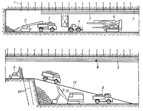 Рис. 4. Схема сооружения камер и тоннелей уступным забоем: 1 — анкерное крепление; 2 — породопогрузочная машина; 3 — автомобиль-самосвал; 4 — автопогрузчик с рамой; 5 — вентиляционный трубопровод; 6 — сомоходная буровая установка; 7 — предохранительная металлическая сетка; 8 — бетонная крепь; 9 — буровой станок; 10 — подземный экскаватор; 11 — взрывные скважины; 12 — пандус.