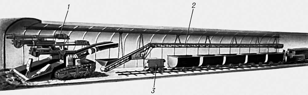 Для проходки горизонтальных и наклонных (до 35°) выработок в некрепких породах применяют проходческие комбайны, которые разрушают породу и грузят её в вагонетки или на конвейер (рис. 3 ). Комбайновый способ проведения выработок является более безопасным и эффективным, чем буровзрывной; при этом почти не нарушается целостность окружающих выработку пород. Вслед за подвиганием забоя в выработке устанавливают крепь, монтируют новые звенья рельсовых путей, конвейера, трубопроводы вентиляционные и противопожарного водоснабжения и др.