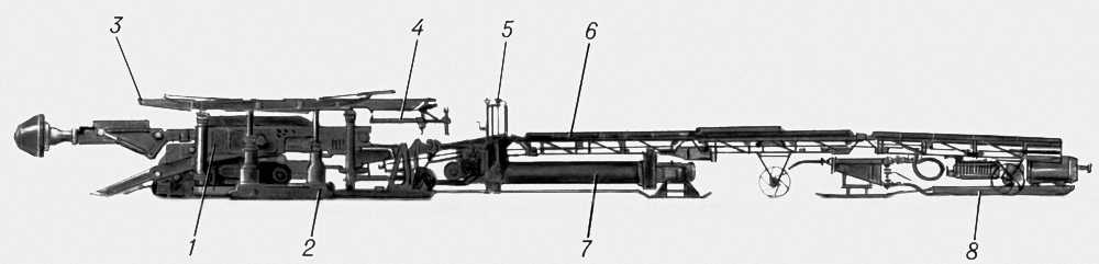 Рис. 3. Проведение выроботок комбайновым комплексом: 1 — проходческий комбайн; 2 — боковые секции крепи; 3 — перекрытие над комбайном; 4 — кассета для металлической сетки; 5 — бурильная установка для возведения анкерного крепления; 6 — перегружатель ленточный передвижной; 7 — пылеулавливающая установка; 8 — насосная установка.