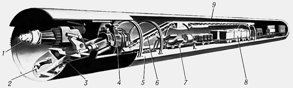 Рис. 5. Сооружение тоннелей щитовым комплексом: 1 — исполнительный орган; 2 — погрузочный орган; 3 — щит; 4 — блокоукладчик; 5 — передвижная платформа; 6 — перегружатель; 7 — блоковоз; 8 — вагонетки; 9 — блочная крепь.