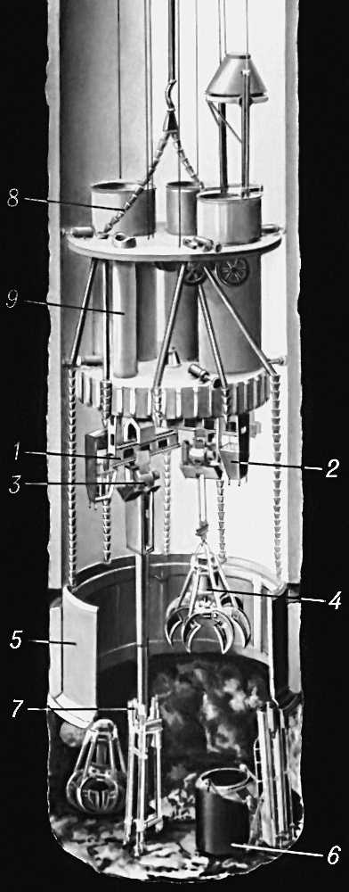 Рис. 1. Схема проходки ствола механизированным комплексом: 1 — погрузочная машина; 2 — кабина машиниста; 3 — спаренный пневмотельфер; 4 — грейфер; 5 — передвижная опалубка; 6 — соморазгружающаяся бадья; 7 — бурильная установка; 8 — бетонораспределитель; 9 — двухэтажный подвесной полок.