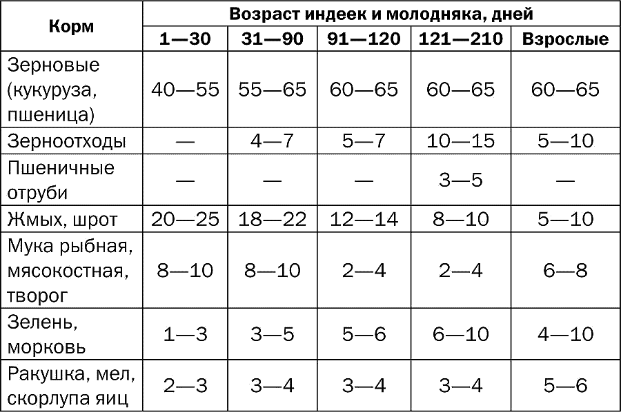 В холодное время года индеек кормят 3 раза в день. Примерный суточный рацион на одну птицу может включать: 180 г зерна, 30 г отрубей, 200 г сухих белковых кормов, 50 г витаминной травяной муки, 60 г сочных кормов, 120 г картофеля (обязательно вареного). Примерные рецепты кормовых смесей для индеек и молодняка представлены в табл. 1.