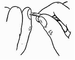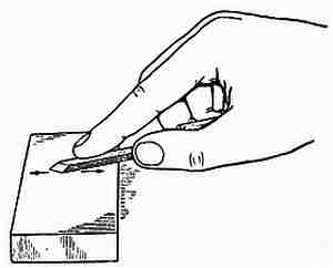 Наконец, режущую вершину штихеля вдавливают в мягкое дерево. Для проверки остроты штихеля слегка касаются вершиной штихеля ногтя большого пальца (фиг. 237), если он легко входит в ноготь, следовательно, заточен хорошо. Важно спять острые кромки, иначе штихель будет производить не резание, а шлифовку. Шлифованную же поверхность бывает трудно удалить.
