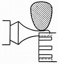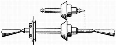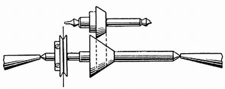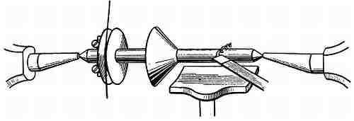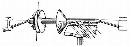 Иногда необходимо несколько укоротить конус, изготовленный вначале обработки оси, чтобы обеспечить достаточно высокую посадку ролика. Сначала обрабатываемый участок оси грубо обтачивается вершиной штихеля, а затем обтачивается более тщательно до получения пологого конуса; обработка ведется до тех пор, пока двойной ролик не будет устанавливаться на этом участке оси на расстоянии от ее конуса, равном высоте ролика.