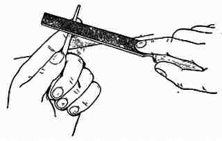 Цапфу и канавку центра очищают сердцевиной бузины, после чего шлифуют пятку цапфы. Шлифовальный инструмент имеет ту же форму, что полировальный инструмент, и изготовить его нетрудно. После того как напильником ему придана необходимая форма, закаливают рабочий конец, оставляя его твердым. Рабочая сторона правится на наждачном бруске, как показано на фиг. 264.