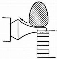 Вернемся к примеру обработки оси баланса. Если заготовка овальная, штихель будет резать металл только в двух местах. По мере образования цилиндрической формы поверхность обработки увеличивается, и когда деталь примет правильную цилиндрическую форму, процесс резания становится непрерывным. Обточку заднего конуса оси продолжают до тех пор, пока он не примет правильную форму (фиг. 239).