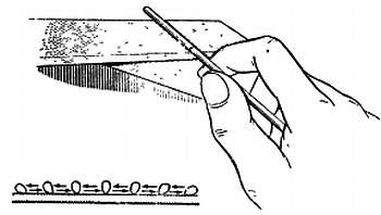 Прежде чем приступить к обработке, необходимо проверить штихели. Важно, чтобы они были острыми и лезвие не было тонким. При доводке штихель держат так, как показано на фиг. 234, и производят заточку на оселке овальными движениями, создавая значительное давление.
