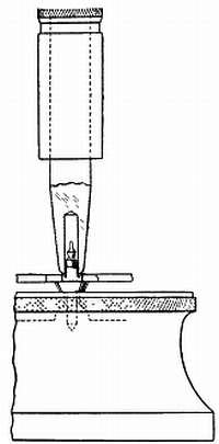 Для обтачивания нижней цапфы оси баланс закрепляют на оси. Оправку снимают и баланс ставят на стальную наковальню. Убеждаются в том, что поверхность наковальни чиста. Баланс устанавливают в требуемое положение и запрессовывают его на посадочный уступ оси. При помощи плоского пуансона с отверстием, достаточным для прохода верхней части оси, расклепывают ось в перекладине баланса (фиг. 265).