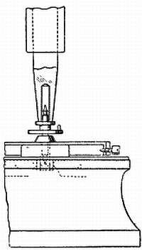 Не снимая заготовку со станка, производят чистовую обработку конуса и полируют его. Для полировки применяют полировальный инструмент (фиг. 203), на который предварительно наносят смесь крокуса и масла и затем быстро перемещают лук вверх и вниз с одновременным перемещением полировального инструмента вперед и назад так, чтобы деталь вращалась в направлении, противоположном направлению движения полировального инструмента. Так как при перемещении лука вниз полировальный инструмент идет вперед (см. фиг. 240), нет необходимости отводить полировальный инструмент от детали.