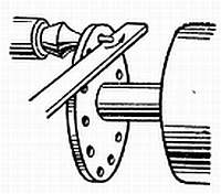 Когда при обточке применяется лук, резанье производится только при движении лука вниз. Когда движение вниз закончится, штихель отводят от детали, лук перемещают вверх, и деталь свободно вращается в обратном направлении. Чтобы начать обработку, лук перемещают вверх и штихель подводят к детали. Штихель должен очень устойчиво опираться на подручник (фиг. 238).