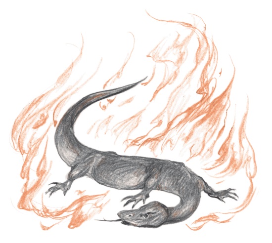 Ящерка, именуемая так по-гречески, ибо огня не боится, среди величайшего жара сидит себе и ничего, токмо усмехается и более того – способна огонь тот погасить. Промеж всех гадов ядовитых саламандра самая пренаиядовитейшая, потому как, ежели иной-то гад ядовитый один токмо раз отравой убивает, то саламандра в силах прибивать по нескольку раз и многих. И делает сие тем, что ежели на дерево какое заберется, то каждый плод без исключения ядом отравляет, а кто хотя ж бы кусочек такого плода отведает, тот на месте и скончается. А ежели саламандра в колодезь или ручей свалится, то яд ее убьет любого, кто водою отравленной уста увлажнит. Таковое причинилось Александру, великому царю Македонии, у коего в Индиях, напившись воды из реки, саламандрой отравленной, две тысячи лошадей пало и четыре тысячи человек умерли.