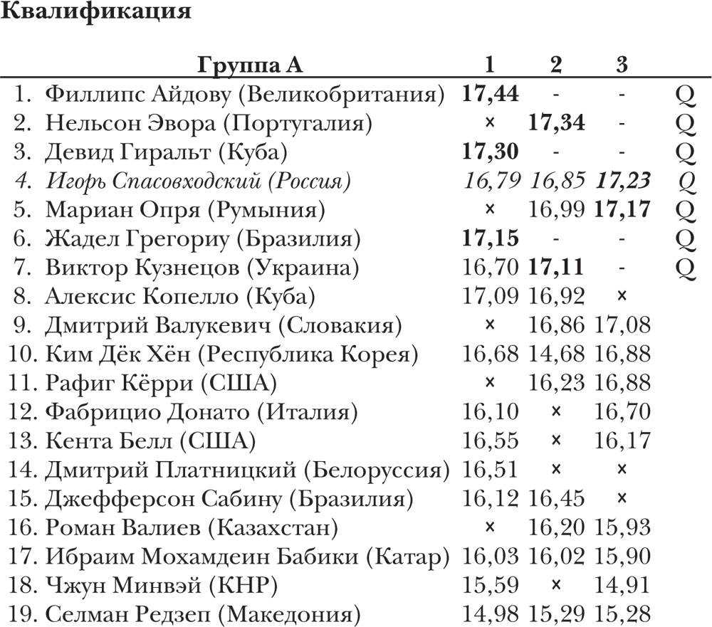 В Пекине в квалификации норму 17,10 выполнили ровно 12 человек, еще четверо прыгнули 17 метров и дальше, но остались за бортом финала (ранее за 17 метров в одних соревнованиях прыгали максимум 10 спортсменов и было это в 1993 году на чемпионате мира). Только Игорь Спасовходский из россиян сумел попасть в финал. После прыжков на 16,79 и 16,85 он смог сделать отличный прыжок на 17,23. Увы, Данил Буркеня был далек от своих лучших результатов – 16,69, Александру Петренко не хватило до финала 13 сантиметров – 16,97.