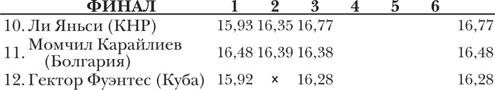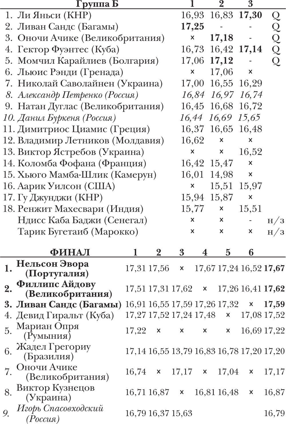 События разворачивались с калейдоскопической быстротой. Ливан Сандс из Багамских островов, установив национальный рекорд – 17,59, стал вторым.