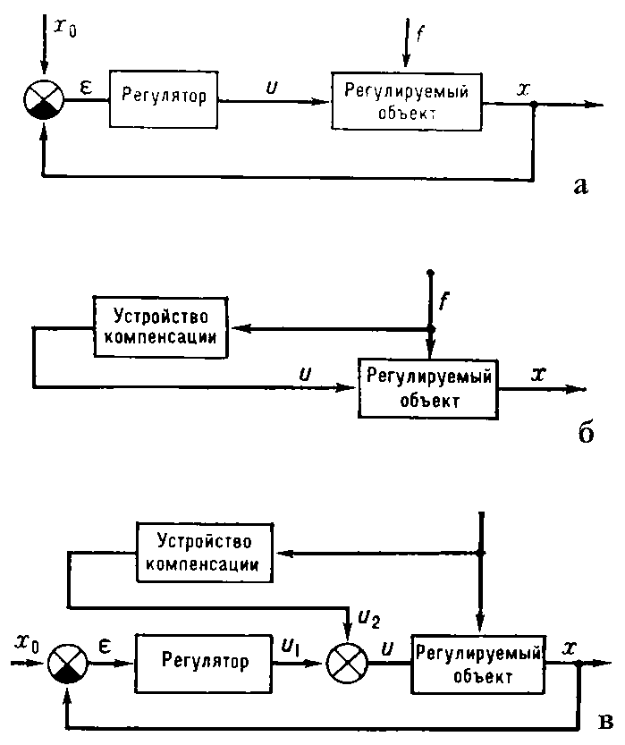 Структурные схемы автоматического регулирования по отклонению (а), по возмущению (б) и комбинированного (в): x0 — заданное значение регулируемой величины; e — динамическая ошибка (рассогласование); u — управляющее воздействие; f — возмущающее воздействие (нагрузка); x — регулируемая величина; кружком, разделенным на секторы, обозначено сравнивающее устройство.
