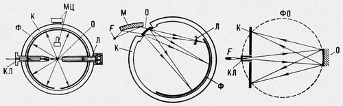 Рис. 2. Основные схемы рентгеновских камер для исследования поликристаллов: а — дебаевская камера;б — фокусирующая камера с изогнутым кристаллом-монохроматором для исследования образцов «на просвет» (область малых углов дифракции); в — фокусирующая камера для обратной съёмки (большие углы дифракции) на плоскую кассету. Стрелками показаны направления прямого и дифрагированного пучков. О — образец; F — фокус рентгеновской трубки; М — кристалл-монохроматор; К — кассета с фотоплёнкой Ф; Л — ловушка, перехватывающая неиспользованный рентгеновский пучок; ФО — окружность фокусировки (окружность, по которой располагаются дифракционные максимумы); КЛ — коллиматор; МЦ — механизм центрировки образца.