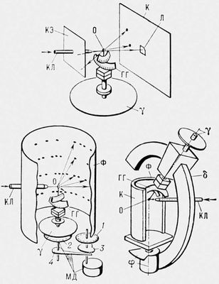 Рис. 3. Основные схемы рентгеновских камер для исследования монокристаллов: а — камера для исследования неподвижных монокристаллов по методу Лауэ; б — камера вращения. На фотоплёнке видны дифракционные максимумы, расположенные по слоевым линиям; при замене вращения на колебание образца число рефлексов на слоевых линиях ограничено интервалом колебаний. Вращение образца осуществляют с помощью шестерёнок 1 и 2, колебания его — через капоид 3 и рычаг 4; в — рентгеновская камера для определения размеров и формы элементарной ячейки. О — образец; ГГ — гониометрическая головка; γ — лимб и ось поворота гониометрической головки; КЛ — коллиматор; К — кассета с фотоплёнкой Ф; КЭ — кассета для съёмки эпиграмм (обратная съёмка); МД — механизм вращения или колебания образца; φ — лимб и ось колебания образца; δ — дуговая направляющая наклонов оси гониометрической головки.