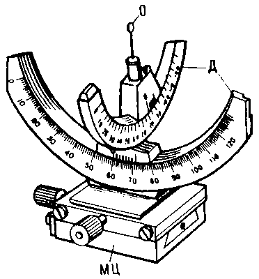 Рис. 1. Гониометрическая головка: О — образец; Д — дуговые направляющие для наклона образца в двух взаимно перпендикулярных направлениях; МЦ — механизм центрировки образца, служащий для выведения центра дуг, в котором находится образец, на ось вращения камеры.